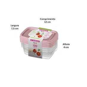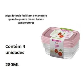 Kit Com 4 Potes herméticos Para Comida De Criança Bebê Com Tampa Livre Bpa 280ml Moderno e arrojado. Vai ao freezer, microondas e lava-louças. Pegadores laterais que facilitam o manuseio do pote quando aquecido ou em baixa temperatura. Tampa com saliências nas extremidades que facilitam a abertura do produto. Linhas de graduação de volume que facilitam o controle da quantidade de alimento armazenado. ESPECIFICAÇÕES: - Material: Plástico - Hermético - Pode ir ao micro-ondas - Prático e fácil - Pote resistente - Livre de BPA DIMENSÃO: - Medida pote: C 14,5 x L 9 x A 4 cm