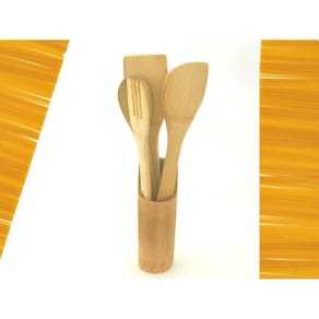 Kit com 4 talheres de bambu com suporte, sendo 1 Colher, 1 Garfo, 1 Espátula, 1 Espátula Pão Duro e Suporte. Especificações:1 Colher de Bambu: 28cm1 Garfo de Bambu: 28 cm1 Espátula de Bambu: 30cm1 Espátula Pão Duro de Bambu: 30cm1 Suporte de Bambu: 17cm x 6cm(as medidas podem sofrer pequenas alterações por se tratar de produto natural)Conteúdo da Embalagem: Kit Com 4 Talheres de Bambu + 1 Suporte de Bambu