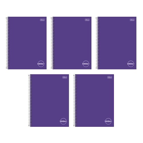 - Kit com 5 cadernos de capa dura na cor roxa - Cada caderno possui 96 folhas pautadas - Formato espiral que assegura praticidade - Papel de qualidade para escrita suave - Design moderno e exclusivo da linha Zoom Tilibra