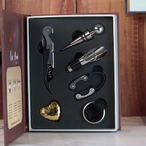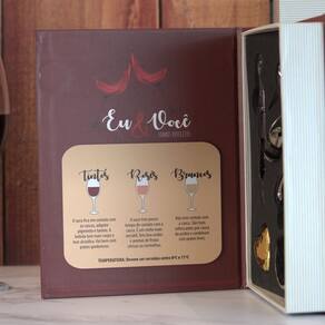 A escolha de um vinho deve sempre ser baseada na ocasião em que será servido, festa, reunião, jantar... Cada ocasião pede um vinho diferente, mas todas combinam com amor e acessórios!É o presente perfeito para quem irá compartilhar com você este momento.Estojo em MDF formato livro com pintura temática, perfeita para completar sua coleção e agregar na decoração do ambiente.Especificações do produto:Material do Estojo: MDFMaterial dos acessórios: Metal.Dimensões do produto:Altura: 21cmLargura: 4cmComprimento: 16,5cmItens Inclusos:- Estojo decorado- Saca Rolhas.- Tampa para Garrafa.- Oxigenador.- Corta Lacre.- Anel Salva Gotas.- Enfeite Coração.
