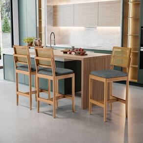 Apresentamos a você as banquetas Milena, estruturadas em madeira maciça com tela palha sextavada nos encostos, assentos estofados com espuma D-23.