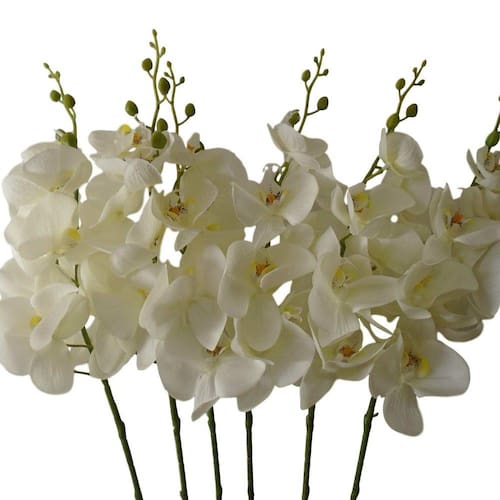 Kit com 6 hastes de flores artificiais orquídea Phalaenopsis na cor branca em silicone toque real.
