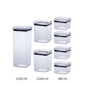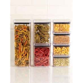 O kit com 7 potes acrílicos vai te ajudar a manter sua casa muito mais organizada. Eles são empilháveis e quadrados, o que faz você economizar muito mais espaço e dá muito mais visibilidade para todos os itens dentro do armário. Ele é perfeito para condimentos secos