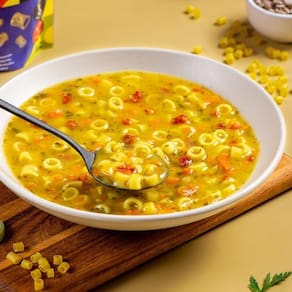 Descrição: Sopa nutritiva com vegetais e macarrão funcional à base de farinha de banana verde.