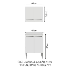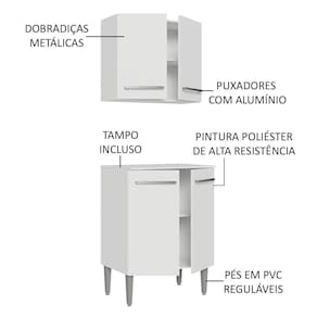 Tanto o armário aéreo quanto o balcão possuem dobradiças metálicas resistentes e puxadores com alumínio. Com espaço interno bem distribuído, são ideais para a organização de louças, eletroportáteis, mantimentos e o que mais você preferir. Os pés em PVC possuem regulagem para ajustes de pequenos desníveis do piso.