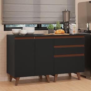 Com visual marcante e toque retrô, a linha Reims se destaca pelos pés em madeira maciça no estilo palito, inspirados no design dos anos 1960. Os detalhes reforçam a sofisticação: puxadores em metal, corrediças e dobradiças metálicas, além do tampo removível ideal para quem deseja instalar pedra ou cooktop e personalizar conforme sua necessidade.