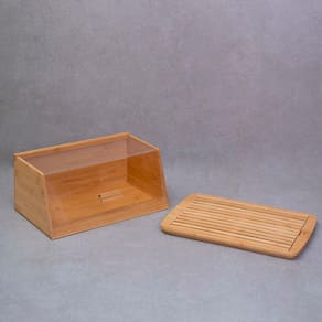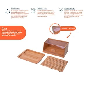 O porta pão é de bambu e acrílico e a tábua migalheira é de bambu. Para limpar, basta utilizar um pano úmido, secar em seguida e manter em local arejado.
