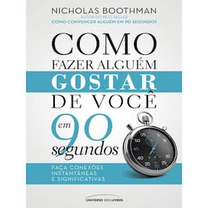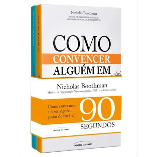 Kit composto pelos livros “Como convencer alguém em 90 segundos” e “Como fazer alguém gostar de você em 90 segundos” do renomado autor Nicholas Boothman, especialista mundialmente conhecido em transformar primeiras impressões em relacionamentos duradouros. Livro 01 – Como convencer alguém em 90 segundos Como convencer alguém em 90 segundos é a garantia de uma comunicação de sucesso, transformando as conexões instantâneas em duradouras e produtivas relações de negócios. Neste livro, o especialista Nicholas Boothman ensina como usar o rosto, o corpo, a atitude e a voz para causar uma primeira impressão marcante, estabelecendo confiança imediata e criando fortes vínculos de credibilidade. Livro 02 – Como fazer alguém gostar de você em 90 segundos Aprenda a criar uma impressão positiva por meio de sua atitude e linguagem corporal e a fazer conexões instantâneas e significativas, tirando melhor proveito do momento mais crítico de qualquer relacionamento: os primeiros 90 segundos! Seja para participar de uma entrevista de emprego, vender um produto, gerenciar um negócio, apresentar uma ideia ou mesmo procurar sua alma gêmea, o segredo do sucesso está em conseguir se conectar com outras pessoas. E você pode fazer isso em até 90 segundos com o auxílio de Nicholas Boothman, mestre em Programação Neurolinguística (PNL) e autor best-seller. Em Como fazer alguém gostar de você em 90 segundos, o autor fornece um passo a passo para não apenas obter a atenção de alguém, mas manter a pessoa atenta por tempo suficiente para captar sua mensagem ou intenção! Para isso, ele apresenta conceitos importantes como sincronia e linguagem corporal aberta e fechada, além de ensinar como ser um ouvinte ativo e a identificar as três preferências sensoriais mais importantes: visuais, auditivas e cinestésicas. Boothman indica ainda dezenas de exercícios curtos e simples para ajustar suas habilidades naturais de se conectar com outras pessoas. Desenvolva sua capacidade de se comunicar efetivamente e faça conexões instantâneas e significativas em até 90 segundos!
