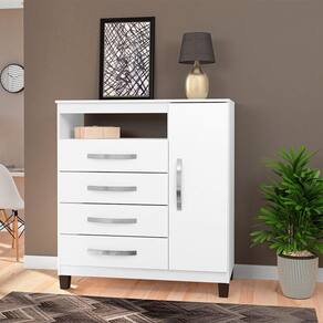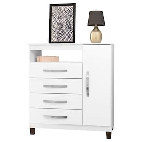 Cômoda Sapateira Cannes possuí 4 gavetas com puxadores cromados e 1 porta lateral