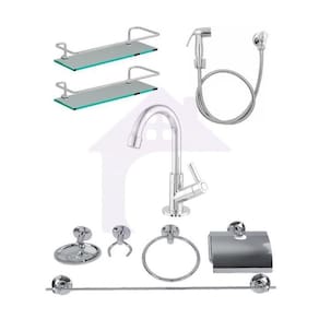 01 porta toalha de banho 47 cm 01 porta toalha de rosto 01 saboneteira 01 papeleira 01 cabide duplo 02 porta shampoo reto vidro 01 ducha higienica 01 torneira abs cod 123