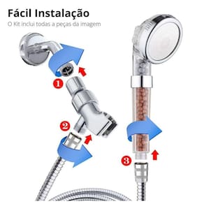 KIT completo Chuveiro/Ducha de alta pressão com filtragem KIT completo e pronto para instalação: Chuveiro, mangueira 1,5m , adaptador para fixação, braço do chuveiro rosca 1/2 , fita veda rosca.Este chuveiro é uma grande inovação no mercado.Ele é perfeito para pessoas que querem tomar um banho gostoso com água forte.Em um único produto você possui um chuveiro de alta pressão, economia e filtragem de água. Uma das principais características desse chuveiro são as bolinhas minerais que ele possui. Essas bolinhas minerais conseguem purificar a água, eliminar cloro presente na água e reduzir impurezas. Um banho com águas mais limpas e livre de impurezas trará resultados grandes para você: peles mais suaves e cabelos mais saudáveis. Além disso, o chuveiro ajuda a economizar água uma vez que possui um design inteligente onde os furos são extremamente pequenos fazendo com que a pressão aumente muito e se gaste menos água do que os chuveiros comuns. A economia de água pode chegar até 30% em comparação aos outros modelos convencionais. Outra grande vantagem desse chuveiro é a alta pressão que ele possui. A força da água que sai é muito maior comparado aos chuveiros comuns e traz a sensação de banhos oferecidos em SPA. Você pode optar por 3 tipos de saída de água: jato, chuva ou massagem. A regulam é feita diretamente na lateral da cabeça do chuveiro. A instalação do produto é muito simples. Em poucos minutos a instalação é feita devido ao ajuste ideal para o encanamento padrão de qualquer residência. O Kit já acompanha todas as peças e acessórios. O chuveiro, a mangueira, o adaptador e o braço do chuveiro todos possuem rosca de 1/2 polegadas, tamanho padrão da grande maioria dos encanamentos. A limpeza do chuveiro é muito fácil também. Basta apenas desrosquear as o chuveiro, limpar ou remover eventuais sujeiras, e depois rosquear de volta. O processo é simples, rápido e não exige o uso de nenhuma ferramenta. IMPORTANTE: o chuveiro não possui sistema de aquecimento e é indicado para locais que possuem aquecimento de água a gás. CARACTERISTICAS TECNICAS: Aplicação: Banheiros e lavatórios Material: ABSRosca: 1/2 polegada Dimensões da caixa: 28x10x9cmPeso aproximado: 0,6KG Inclui: Chuveiro, mangueira, adaptador fixação, braço do chuveiro, fita veda rosca.