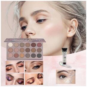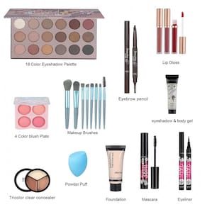 O Kit Completo de Maquiagem MONRUEVT All-in-One reúne 18 tons versáteis de sombras em paleta, gloss labial, lápis para sobrancelhas de precisão, blush de cobertura ajustável, corretivo de alta cobertura, base leve, máscara volumizante para cílios e delineador à prova de borrões em embalagem compacta de 20 x 15 x 4,9 cm. ?