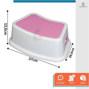 Características Técnicas – Degrau Infantil: Material: Polipropileno (PP) Modelo: Rosa Peso suportado: Até 80kg Peso: 0,46 kg Dimensões: 13,5cm (A) x 26,5cm (L) x 37cm (C) Medidas da base dos pés: 19cm (L) x 29cm (C) Idade recomendada: A partir de 18 meses Ref.: 17282
