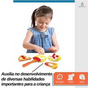 Ele é composto por: • 1 grill com recortes em forma de ingredientes • 2 pratos • 1 espátula • 1 pegador • 1 cortador em formato de pizza • 1 cortador em formato de ovo • 3 potinhos de massinha de modelar (cores podem variar)