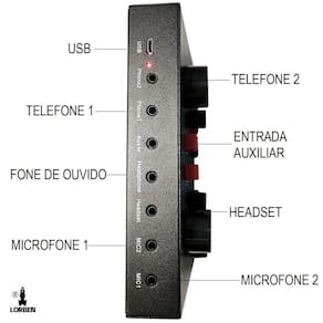 Aceita duas entradas P3 de áudio de celular, uma de auxiliar e duas entradas de microfone.