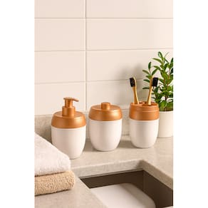 Composição do produto: 1 dispenser para sabonete líquido 300 ml 1 porta-hastes/algodão 1 porta-escovas
