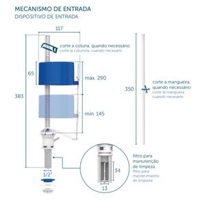 - Marca: Blukit; - Referência: 340292; - Material: Plásticos de Engenharia, Elastômeros, Aço Inoxidável AISI 304 e Liga de Cobre; - Modelo: Astra e Blukit; - Acionador: Branco; - Acompanha vedação, kit para fixação, mecanismo de entrada e saída; - Ciclos de garantia: 15.000; - Classe de pressão: 1 a 75 m.c.a.; - Possui filtro para manutenção de limpeza; - Nível de água ajustável na caixa de descarga; - Rosca de entrada: 1/2''; ?- Rosca de saída: 2''; - Temperatura máxima de trabalho: 45 C; - Resistente a baixas e altas pressões; - Garantia: 12 meses junto ao fabricante.