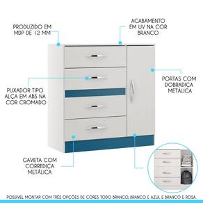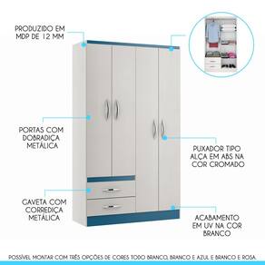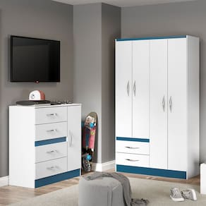 Você merece o melhor quando se trata de móveis para sua casa e a escolha certa para atender todas as suas necessidades. Com um design atual, une versatilidade, conforto e beleza. Com o Kit de Guarda-Roupa e Cômoda, você terá muito espaço para manter tudo organizado. Dispõe da montagem flex, possibilitando escolher qual cor combina mais com o seu ambiente, toda branca, branca e azul ou branca e rosa. Produzida com materiais de excelente qualidade, garantindo a sua resistência ao desgaste diário e mantendo sua beleza e funcionalidade por muito tempo. O melhor em móveis no design atual aliando conforto, qualidade e ótimos preços, só na Menu Móveis! CARACTERÍSTICAS TÉCNICAS GUARDA-ROUPA: - Produzido em MDP de 12 mm - Acabamento UV na cor Branco - Portas com Dobradiça Metálica - Gavetas com Corrediça Metálica - Puxadores Alça em ABS na cor Cromado INFORMAÇÕES TÉCNICAS GUARDA-ROUPA: Altura: 179 cm Largura: 105 cm Profundidade: 40 cm Peso: 51 kg CARACTERÍSTICAS TÉCNICAS CÔMODA: - Caixa em MDP de 12 mm - Acabamento UV na cor Branco - Portas com Dobradiça Metálica - Gavetas com Corrediça Metálica - Puxadores Alça em ABS na cor Cromado INFORMAÇÕES TÉCNICAS CÔMODA: Altura: 93 cm Largura: 90 cm Profundidade: 40 cm Peso: 32 kg INFORMAÇÕES ADICIONAIS: *ATENÇÃO: Não trabalhamos e não nos responsabilizamos pela montagem do móvel. Antes da montagem conferir se o produto está de acordo com o que comprou, produto montado e danificado pela montagem não será aceito troca. **As imagens ambientadas são meramente ilustrativas e podem apresentar itens que não compõe o produto. As cores do produto podem variar de acordo com o monitor, a iluminação do ambiente ou sua percepção visual. ***Limpeza: Deve ser feita com pano macio e seco ou levemente umedecido com água e sabão neutro. Não devem ser utilizados abrasivos como palha de aço e objetos cortantes. Garantia para defeitos de fabricação conforme Código de Defesa do Consumidor.