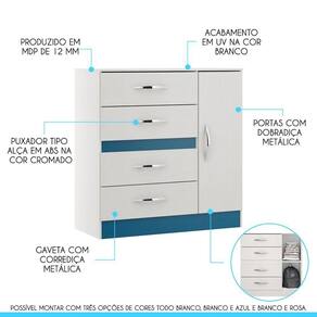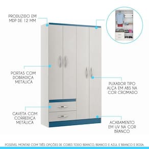 MDPVocê merece o melhor quando se trata de móveis para sua casa e a escolha certa para atender todas as suas necessidades. Com um design atual, une versatilidade, conforto e beleza. Com o Kit de Guarda-Roupa e Cômoda, você terá muito espaço para manter tudo organizado. Dispõe da montagem , possibilitando escolher qual cor combina mais com o seu ambiente, toda branca, branca e azul ou branca e rosa. Produzida com materiais de excelente qualidade, garantindo a sua resistência ao desgaste diário e mantendo sua beleza e funcionalidade por muito tempo. O melhor em móveis no design atual aliando conforto, qualidade e ótimos preços, só na Menu Móveis!