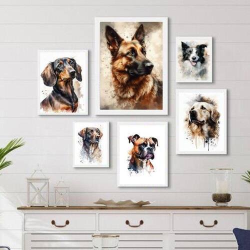 Kit composição 6 quadros cachorro raças variadas - com vidro Moldura: madeira branca Informações do produto tire todas as suas dúvidas no descritivo abaixo: decoração para quarto, sala, cozinha, escritório, área gourmet e muito mais. Chega de paredes vazias medidas - kit composto por 6 quadros, sendo 2 quadros com medida 18x24cm, 3 quadros com 24x33cm e 1 quadro com medida 33x45cm. Material do papel - papel fotográfico brilhante de altíssima resolução acabamento - todos os quadros são acompanhados de vidro para proteção da imagem. - moldura em madeira maciça na cor preta ou branca conforme produto escolhido e pendurador . - os quadros são embalados de forma segura com plástico bolha com camada dupla de acordo com o tamanho dos quadros. Garantia - garantia de 3 meses. Meu quadro chegou. Como posso fixá-lo Você precisa apenas de um martelo e um prego, pois os quadros já vão acompanhados de penduradores. Esta é a forma mais indicada. Como posso limpar meu quadro A limpeza é feita como um móvel comum da sua casa. Apenas um pano seco ou espanador são suficientes para tal Ean: 7895212236667