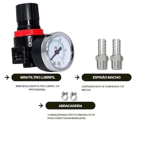 Kit de Acessórios para Ar Comprimido com Espigão, Braçadeira e Regulador Filtro Lubrifil Descrição do Produto: Otimize o desempenho do seu sistema de ar comprimido com este conjunto completo e de alta qualidade. Ideal para profissionais que buscam precisão, durabilidade e eficiência em suas operações diárias. Componentes do Kit: Espigão Macho 1/4 NPT x Mangueira 5/16: Conexão segura e firme para mangueiras de 5/16.Rosca macho de 1/4 NPT, garantindo compatibilidade com uma ampla variedade de equipamentos.Fabricado em material resistente para maior durabilidade.Braçadeira HDFLX Simples 9mm; D07-09mm: Perfeita para fixação de mangueiras, proporcionando vedação segura e eficiente.Fabricada em aço de alta qualidade, garantindo longa vida útil e resistência à corrosão.Fácil de instalar e ajustar.Mini Regulador Filtro Lubrifil 1/4 Profissional: Regula a pressão do ar para um nível seguro e eficiente, protegendo seus equipamentos pneumáticos.Inclui filtro para remover partículas e umidade do ar comprimido, aumentando a vida útil das ferramentas.Compacto e robusto, ideal para em ambientes exigentes. Características: Durabilidade: Todos os componentes são fabricados com materiais de alta qualidade para garantir um desempenho duradouro e confiável.Facilidade de Uso: Conexões rápidas e braçadeiras ajustáveis tornam a instalação simples e prática.Precisão: O regulador permite ajustes precisos, mantendo a pressão ideal para suas ferramentas pneumáticas.Proteção: O filtro integrado remove partículas e umidade, protegendo seus equipamentos contra danos. Aplicações: Este kit é indispensável para oficinas mecânicas, indústrias, serviços de manutenção e qualquer outro ambiente que utilize sistemas de ar comprimido. Ideal para garantir conexões seguras e regulagem precisa da pressão, aumentando a eficiência e a segurança das suas operações. Garanta já o seu Kit de Acessórios para Ar Comprimido e eleve o nível do seu sistema com componentes de alta qualidade e desempenho. Compre agora e experimente a diferença Marca: Não Informado Ean: 7891686783447