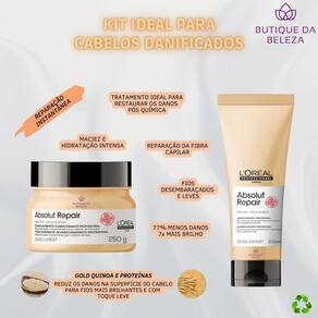Este kit contém 01 condicionador loréal absolut repair gold quinoa 200ml01 máscara loréal absolut repair gold quinoa 250mlA linhaL'oréal absolut repair gold quinoa + protein é uma linha para cabelos danificados.Ela age na reparação da superfície do fio, dando muito mais brilho, maciez e leveza.Absolut repair é a solução definitiva para reparação instantânea sob medida para fios danificados.AtivosGold quinoa e proteínas: reduz os danos na superfície do cabelo para fios mais brilhantes e com toque leve.O cabelo fica limpo, até 77% mais reparado, 7x mais brilhante e com toque suave com o uso da linha completa absolut repair .Indicado- cabelos danificados.- cabelos com quebra.- cabelos ressecados.- cabelos desnutridos.- cabelos opacos.- cabelos com frizz.- todos os tipos de cabelos.Benefícios- reparação dos fios.- reconstrução capilar.- hidratação.- nutrição.- maciez.- brilho.- desembaraço.- força e proteção.- antifrizz.CondicionadorCondicionador l'oréal absolut repair para reestruturação da fibra capilar, facilitando desembarace e devolvendo o brilho.O condicionador conta com ativos poderosos para a reconstrução dos fios, deixando seus cabelos com luminosidade e um toque sedoso incrível, e sem pesar os fios.MáscaraMáscara de tratamento absolut repair foi desenvolvida especialmente para cabelos danificados e grossos. Ela promove uma reparação sob medida e reconstrução instantânea dos fios, trazendo mais brilho, maciez e uma hidratação profunda sem pesar os seus cabelos.Modo de uso CondicionadorDistribua de maneira uniforme por todo o cabelo lavado e seco com uma toalha.Deixe agir de 2 a 3 min. Enxágue. MáscaraEspalhe no cabelo limpo e úmido, nos comprimentos e pontas.Deixe agir por cerca de 5 min e enxágue. DicaPara melhores resultados, use a linha completa absolut repair de l'oréal.