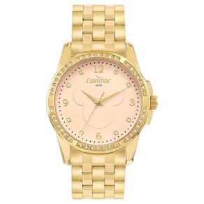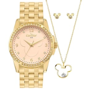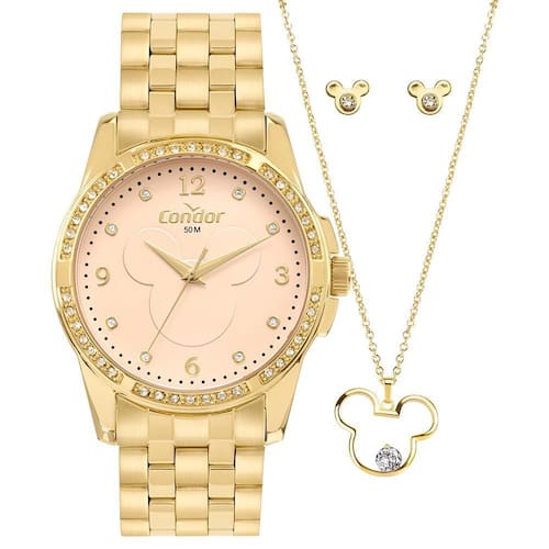 O Kit Condor Feminino Elegante Dourado CO2036MYR/K4J é um conjunto temático da Disney, perfeito para quem valoriza estilo com um toque de nostalgia. O relógio possui caixa de 38 mm em metal dourado, aro com aplicação de pedras brilhantes e mostrador rosé com a icônica silhueta do Mickey em destaque, trazendo charme e personalidade à peça.