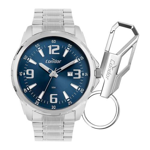 A caixa e a pulseira em aço inoxidável na cor prata reforçam a robustez do modelo, ideal para homens que buscam um relógio marcante para o dia a dia. O modelo conta com calendário diário, resistência à água de até 50 metros e acompanha um chaveiro metálico Condor, adicionando um toque funcional e exclusivo ao kit.