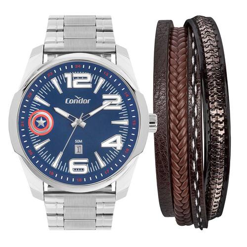 Os super heróis da Marvel chegaram nos Kits Condor Par Perfeito! Modelo com mostrador azul com o escudo do Capitão América na posição de 9h, pulseira de aço 3 links prata, caixa 50mm e 50 metros de resistência à água e ainda acompanha um conjunto de pulseiras modernas. Perfeito para quem é fã desses incríveis personagens.