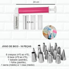 - jogo de bico inox 16 peças: 6 crespos nº0 ao nº5 , 6 lisos nº0 ao nº5 , 1 babado padrão , 1 folha padrão , 1 serra médio e 1 rosa médio