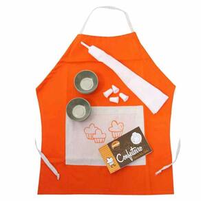 Contém: Avental em tecido de algodão com bolso estampado, 12 forminhas para bolinhos, Saco de confeitar com bicos variados e Mini livro de receita.