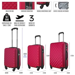 Kit Conjunto 3 Malas Rígidas 360° Contendo uma Mala PP 8kg, uma Mala de bordo 10kg e uma Média 23kg Gladiador D1PMCaracterísticas: - Conjunto com três malas rígidas em ABS;- Cadeado com segredo acoplado nas três malas; - Alças flexíveis superior e lateral para maior conforto e comodidade; - Bolso interno com zíper; - Rodas giratórias em 360º; - Carrinho retrátil com pintura eletrostática e botão liberador.