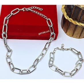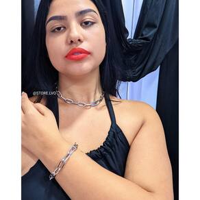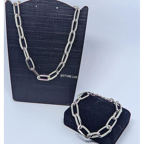 Kit Conjunto Colar Choker e Pulseira Corrente Elo grande Quadrado Folheado Ouro Dourado Prata Acessório Moda Luxo - Cor: Prata