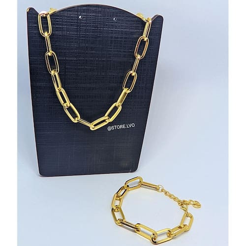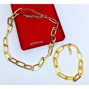 Kit Conjunto Colar Choker e Pulseira Corrente Elo grande Quadrado Folheado Ouro Dourado Prata Acessório Moda Luxo - Cor: Dourado