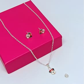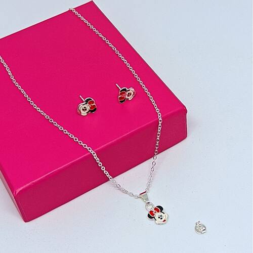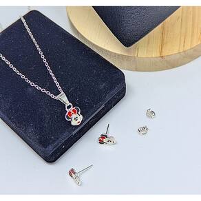 Conjunto Colar e Brincos Infantil Minnie – Charme e Sofisticação com Proteção Folheado a prata com verniz especial, garantindo brilho intenso e durabilidade prolongada. Tecnologia antialérgica, perfeita para a pele delicada das crianças. Corrente com aproximadamente 36 cm + extensor de 5 cm, brinco e pingente com cerca de 0,7 cm. Design clássico e delicado, ideal para ocasiões especiais ou para completar o visual do dia a dia com um toque de elegância.
