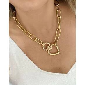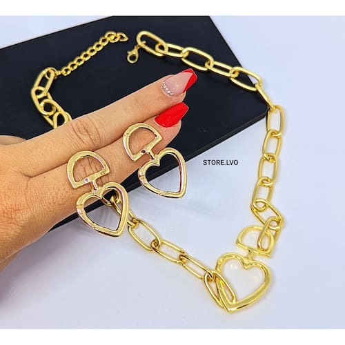 IMPORTANTE: LEIA TODO O ANÚNCIO ANTES DE REALIZAR A COMPRA. TIRE TODAS AS SUAS DÚVIDAS NO CAMPO DE PERGUNTAS.KIT Colar e brinco estilo mosquetão em formato de coração é aquele brinco exótico que vai dar um charme extra no seu visual. Um acessório marcante e muito estiloso que pode ser combinado com peças mais delicadas ou até mesmo com outras peças deste estilo. Seu design é diferenciado com um acabamento incrível do seu banho em ouro amarelo. Uma bela semijoia que é antialérgica e possui garantia de um ano!COLAR MOSQUETÃO- Comprimento do colar regulador: 45CM- Medida do fecho coração: 5,5CM x 3,5 CM- Medida elos: 13 CMMEDIDAS DO BRINCO: - Dimensões: 2,5 x 2 cm; - Peso: 2,5 gramas;