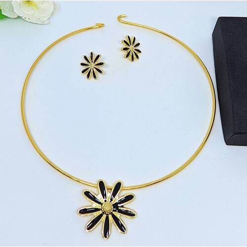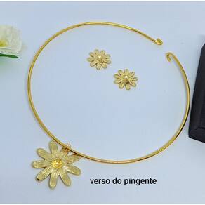 Kit Conjunto Colar e Brincos Feminino Choker aro Liso Orgânco Oval trevo Coração Liso estrela Folheado Ouro Luxo 2025 - Cor: margarida Preta