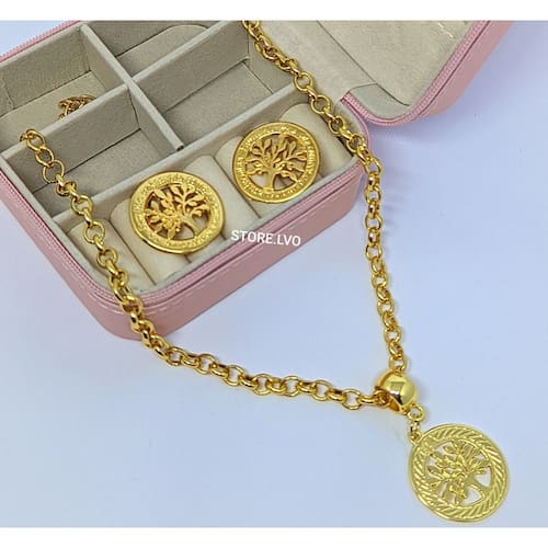 Kit Colar e Brincos Corrente Elo Português com Pingente Medalha arvore da vida