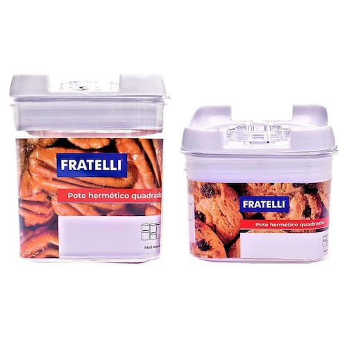 Sem mais confusões na cozinha ---------------------------------------------------------------- MEDIDAS: - 8,5 X 8 X 8 cm AxCxL ; - 11 X 8 X 8 cm AxCxL . CONTEÚDO DA EMBALAGEM: 01 Pote Hermético 280ml.E 01 Pote Hermético 400ml.