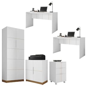 O Conjunto Cubic é moderno, compacto, versátil e trará mais organização em qualquer ambiente que estiver. O conjunto é composto por 1 Gaveteiro, 2 Mesa de 135 Cm, 1 Armário Alto e 1 Armário Baixo, sendo ideal para seu ambiente.- Acompanha manual de montagem- HDF CARB de 3 mm de espessura- Tonalidade do Produto: Branco / Louro Freijo- Estrutura em MDP BP CARB e MDF BP CARB de 15mm de espessura.Dimensões do Produto:Gaveteiro:Altura: 64 cmLargura: 36 cmProfundidade: 37,5 cmPeso: 15,8 kgMesa:(2X)Altura: 76 cmLargura: 135 cmProfundidade: 54 cmPeso: 20,6 kgArmário Baixo:Altura: 76 cmLargura: 68 cmProfundidade: 37,6 cmPeso: 21,75 kgArmário Alto:Altura: 180,7 cmLargura: 68 cmProfundidade: 37,6 cmPeso: 49,66 kgESPECIFICAÇÕES TÉCNICASGaveteiro:- Possui Rodízios para melhor deslocamento- Possui 3 Gavetas com corrediças telescópicas- Puxadores em AlumínioMesa 135 cm:(2X)- Amplo Tampo- Detalhe Frontal com frisos decorativosArmário Alto:- 10 Divisões- 4 Prateleiras- Sapatas plásticas na base- 2 Portas com puxadores em alumínioArmário Baixo:- 4 Divisões- 1 Prateleira- Sapatas plásticas na base- 2 Portas com puxadores em alumínioPeso suportado:- Base 5kg- Tampo 10 kg- Tampo Gaveta 2kg- Gaveta 2kg (cada)- Divisões 2kg (cada)- Garantia 90 dias contra defeito de fabricação- Este conjunto chegará em sua casa separado em 4 volumesDIMENSÕES DA EMBALAGEM:(1º Volume)Altura: 16 cmLargura: 66 cmComprimento: 42 cm(2º,3º Volume)Altura: 10 cmLargura: 143 cmComprimento: 60 cm(4º Volume)Altura: 17 cmLargura: 183 cmComprimento: 42 cm(5º Volume)Altura: 21 cmLargura: 79 cmComprimento: 43 cmRecomendações de limpeza:- Limpar com pano macio, seco ou úmido, sem uso de produtos abrasivos. Pois, podem trazer danos ao produto.Sobre a entrega:- As transportadoras contratadas, não realizam entregas em apartamentos. Realizando assim a entrega na portaria do prédio.*Produto segue desmontado, montagem por conta do comprador.*Imagens do produto são meramente ilustrativas.