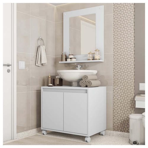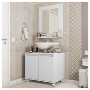 O Gabinete Armario Clean se adapta a sua necessidade, seu design permite que o gabinete fique posicionado abaixo do lavatorio entre a coluna. O Armario possui 6 divisorias com 3 prateiras permitindo guardar objetos, e 1 espelho com prateleira. Feito em MDP FF 15MM garantindo mais durabilidade e resistencia ao produto.