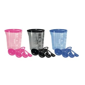 Contém as seguintes medidas: - 1 Colher de Sopa - 1/2 Colher de Sopa - 1 Colher de Chá - 1/2 Colher de Chá - 1 Copo Medidor de 400ml com Graduação de Xícara, Água, Arroz, Farinha e Açúcar.