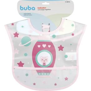 O babador com pega migalhas foguete da buba possui tecido impermeável e bolso pega migalhas, ideal para evitar que o pequeno suje a roupinha. O fecho em tiras adesivas se ajusta facilmente ao pescoço do bebe.