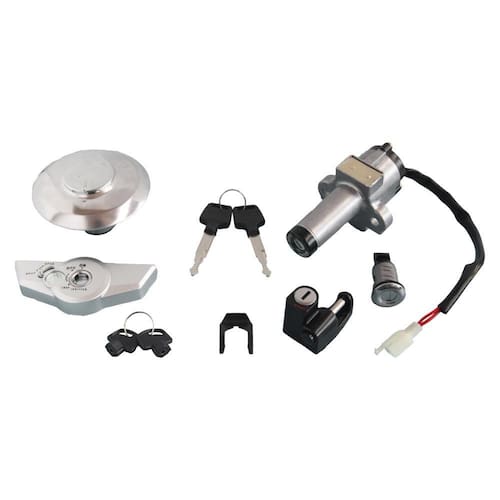 O conjunto de travas tem a função de acionar e/ou destravar, com uma única chave, vários componentes da motocicleta, como: ignição, guidão, tampa do tanque, trava de capacete e trava da tampa lateral.