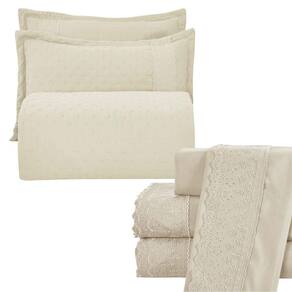 Kit Coordenado Grécia Cobre Leito + Jogo De Cama Queen Bordado Inglês 300 Fios - 7 Peças - Bege