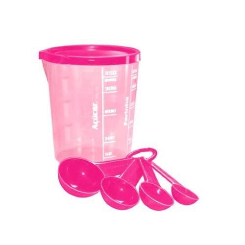 Kit Copo Medida Dosador Graduado com Tampa e 4 Colheres Medidas Rosa