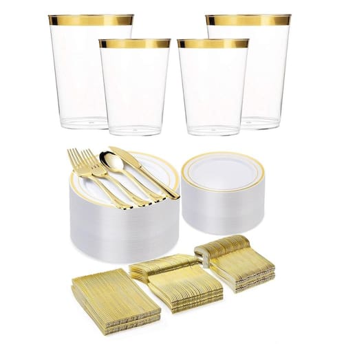 Transforme suas festas em eventos extraordinários com nosso Kit de Materiais Descartáveis de Luxo na cor Dourada Este incrível conjunto de 1.370 peças é a escolha perfeita para quem busca sofisticação sem abrir mão da praticidade. Por que escolher nosso Kit de Luxo: Elegância que Marca Presença: Com pratos 150 grandes 26CM e 150 pratos Medio para sobremesa 19CM , este kit em cor prata vai garantir que sua mesa se destaque pela elegância em qualquer ocasião. Talheres Sofisticados: Desfrute de 160 garfos, 150 facas e 150 colheres para refeição, todos desenhados para unir estilo e conforto, tornando suas refeições ainda mais especiais. Sobremesas Memoráveis: Adoce seus momentos com 150 colheres e 160 garfos para sobremesa de 10CM, adicionando um toque de luxo a cada colherada. Versatilidade Completa: Não esquecemos dos detalhes Incluímos 150 copos de 300ml, proporcionando a versatilidade que suas celebrações merecem. Alta Qualidade, Zero Compromisso: Feito de plástico premium, nosso kit une durabilidade com a praticidade do descartável. Assim, você pode aproveitar o momento sem se preocupar com a limpeza. Seja o Anfitrião que Todos Lembram: Surpreenda seus convidados com a sofisticação deste kit. Não perca tempo, adquira agora e eleve suas celebrações a um novo patamar de estilo e conveniência Composição: Plastico Kit de 1.370 peças 150 Pratos Grande para Refeição 26CM 150 Pratos Medio para Sobremesa 19CM 150 Unidades - Garfo Refeição 18,5CM 150unidades - Faca Refeição 19CM 150 Unidades - Colher Refeição 17,5CM 150 unidades - Colher sobremesa 10cm 160unidades - garfo sobremesa 10cm 150 copos 300ml