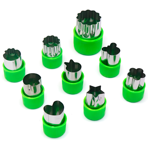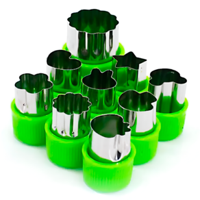 CARACTERÍSTICAS PRINCIPAIS:- Adicione diversão e criatividade na hora de preparar seus alimentos.- Com os diferentes moldes, você pode cortar frutas, legumes, queijos e muito mais. - Fácil de usar, é perfeito para tornar as refeições mais atrativas.- Quantidade: 9pçs.- Material: Inox e Plástico- Tamanho Peças Pequenas: 4 x 2,5cm.- Tamanho Peça Grande: 5,5 x 3,8cm.- Peso do Kit: 119g.TEMOS SEU PRODUTO EM ESTOQUEENVIAMOS SEU PEDIDO EM ATÉ 1 DIA ÚTILAPÓS A CONFIRMAÇÃO DO PAGAMENTO.
