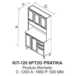 Kit Cozinha 120cm 6 Portas 3 de Vidro 2 Gavetas Pratika Branco