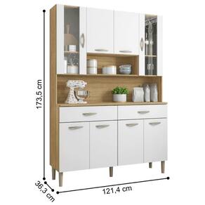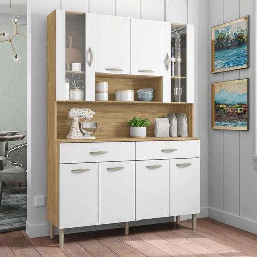 Produzido em MDP de 12mm e 15 mm, com oito portas - sendo duas portas superiores com vidro, dobradiças e corrediças 100% metálicas, duas amplas gavetas, puxadores ergonômicos em plástico resistente (poliestireno), pés fixo em plástico resistente (polipropileno).